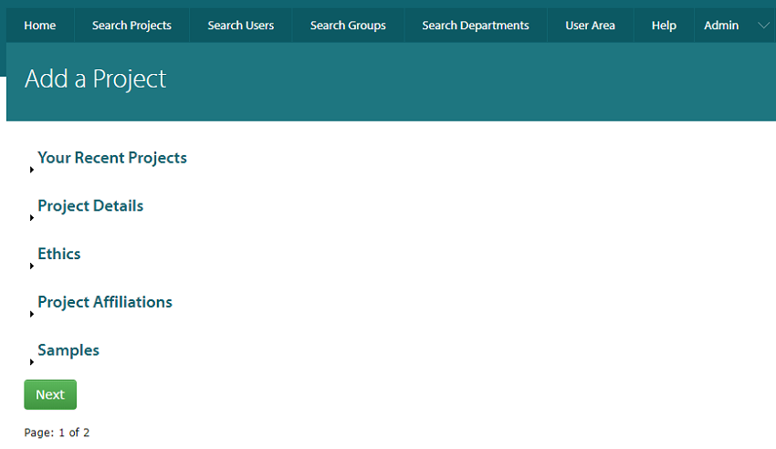 Here you can fill in details of the project you want to add. Fields that are necessary to fill have a red asterix next to them. Each text box has a small icon next that you can hover your mouse over for more information. Further down the ‘Add a Project’ form, you will see the ‘Project Affiliations‘ section. The first option asks you to choose a department. This should be the department within the University of Cambridge that this project falls under. If this a joint project with multiple departments in the university, please chose the department that the Chief Investigator is part of. If your department is not on the list, please select ‘Other’, and type in the name of your department when the text box appears. This will be moderated and an administrator will need to approve this name, this is a measure to ensure to prevent duplications. After you choose a department, you will see the ‘Chief Investigator or Delegate’ section appear. If you are the Chief Investigator you can skip this section. If you are not the Chief Investigator, then you will need to tick this box. If you ticked the box, you will see the following options appear that you will need to fill out. The list of Chief Investigators will be determined by the department you choose. If you are collecting any samples, please tick the box in the ‘Samples’ section. This will display a list of possible samples that you may be collecting. You can then click the ’Next’ button to go to the next page where you can review the data that you have just entered. After checking the data, you can click submit to proceed. After clicking submit, your project will be added to the database and you will be taken back to the ‘Search Projects’ page and you will see your project listed in the table.