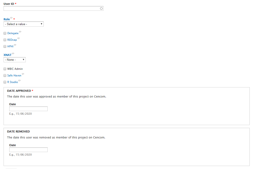 - If you wish to grant this user access to this projects REDCap database, HPHI resources, Safe Haven, or R studio, you can tick the box next to those fields (you can give or remove access later if you wish to).