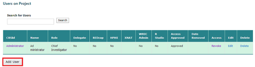 To add a user, navigate to the page of the project you want to add a user to. Scroll to the ‘Users on Project’ section and click the ‘Add user’ button. The ‘Add New Users’ form will pop up
