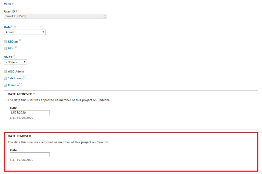 - If you know the date you want this user’s access to your projects systems to be revoked, enter that date in the ‘Date Removed’ section.
