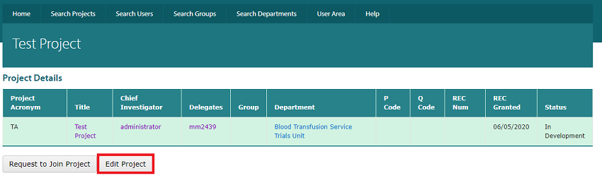 Note: You must be an 'Approved' Chief Investigator or Delegate on the Project to have this functionality.