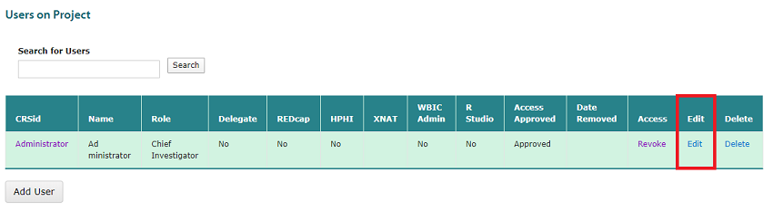 Cencom can be used to grant or revoke a user’s access to project resources on the following systems: REDCap HPHI XNAT R Studio To do so, navigate to the page of the project, scroll to the ‘Users on Project’ section, find the user in the table and click on the Edit button.