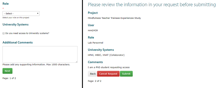 This will bring you to the Project Request Form page. Here you can choose your role on the project, ask for access to University Systems and write comments to explain why you want to join this project. After you have filled out your details, click ‘Next’. Page two of the form allows you to review the details such as the project you have requested to join, the role you have chosen and any comments you have written. After reviewing this you can cancel or submit your request. This request will be added to the Chief Investigator and/or Delegates ‘To Do List’ and they will be able to grant or deny access