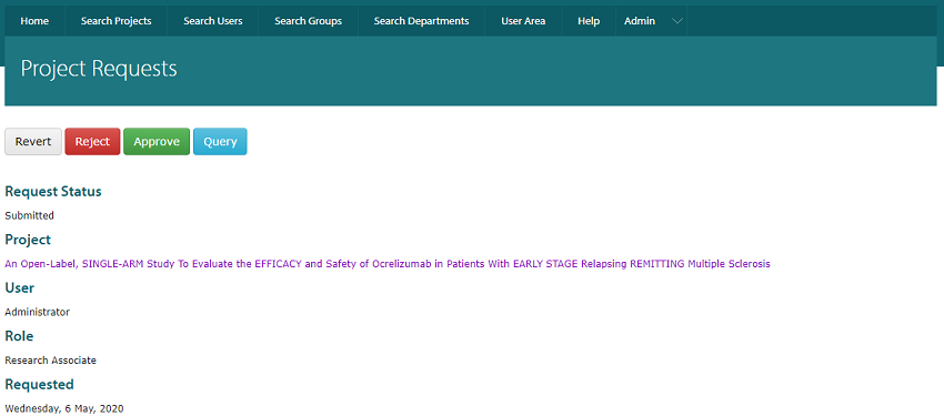 You will be redirected to the project request response page. You can choose to ‘Approve’, ‘Reject’ or ‘Query’ this request. You can always change this decision by clicking the ‘Revert’ button. The user will be informed of your decision after you have made a choice.