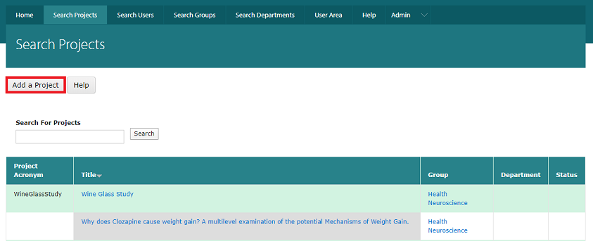 To add a new project to the database, click on the ‘Search Projects’ then click the ‘Add a Project’ button.