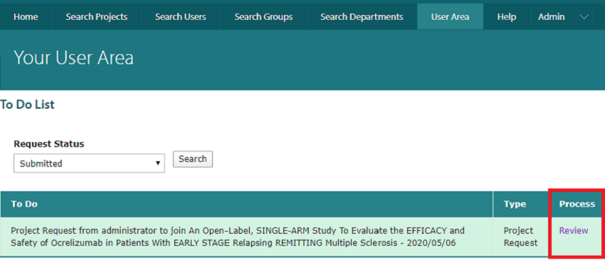 The ‘To Do List’ can be found under the User Area section. The ‘To Do List’ section is a list of any users who has requested to be added to a project that you are a ‘Delegate’ or ‘Chief Investigator’ of. You will have to click on the ‘Review’ button to proceed.